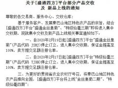 2020.2.13通知:特级仙毫三期下市、特级仙毫四期上市的公告 尊敬的各盛通四方购销商、服务中心、交收仓库: 基于服务客户、发展秦巴山地区特色农产品的宗旨,结合[盛通四方]平台特级仙毫三期(产品代码...